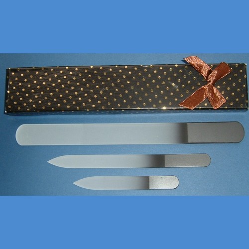 Skleněný pilník na nehtyy délky 90mm,140mm a 200mm,tloušťky 2-3mm. Sametový obal a dárková krabička s mašličkou . Barva krabičky ladí s barvou pilníků.