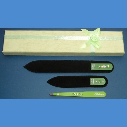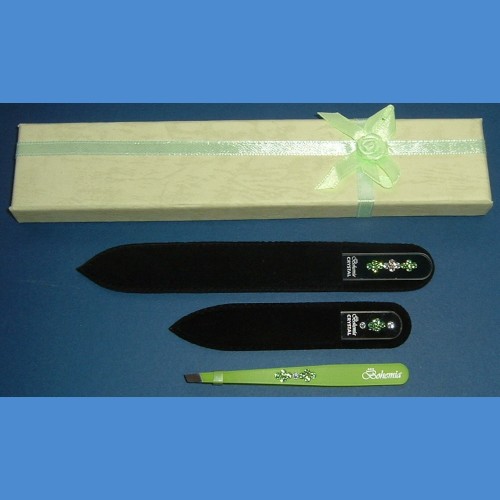 Skleněný pilník na nehtyy délky 90mm a 140mm,tloušťky 2mm, pinzeta délky 90mm vše dozdobeno kameny Swarovski. Potisk pilníku a pinzetky logem Bohemia, sametový obal a dárková krabička s mašličkou .
