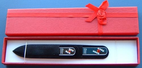 Skleněný pilník na nehtyy délky 90mm a 140mm,tloušťky 2mm. Zdobeno kameny Swarovski, potisk pilníku logem Bohemia, sametový obal a dárková krabička s mašličkou.
