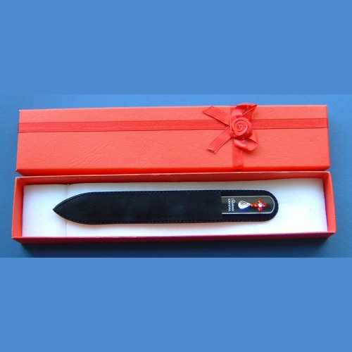 Skleněný pilník na nehty délky 140mm,tloušťky 2mm. Zdobeno kameny Swarovski, potisk pilníku logem Bohemia, sametový obal a dárková krabička s mašličkou .