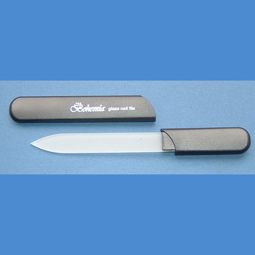 NOVINKA ! Skleněný pilník oboustranný malý tloušťky 2mm v pevném barevném obalu délky 125mm chránící pilník proti zlomení v tašce. Je vhodný pro cestování v autě, autobuse atd. Samotný skleněný pilník je navíc odolnější proti zlomení. Skleněný pilník na nehty je včetně potisku Bohemia.