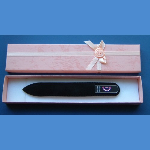 Skleněný pilník na nehty délky 140mm,tloušťky 2mm. Zdobeno kameny Swarovski, potisk pilníku logem Bohemia, sametový obal a dárková krabička s mašličkou .