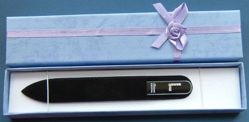 Skleněný pilník na nehty délky 140mm,tloušťky 2mm. Zdobeno kameny Swarovski, potisk pilníku logem Bohemia, sametový obal a dárková krabička s mašličkou .