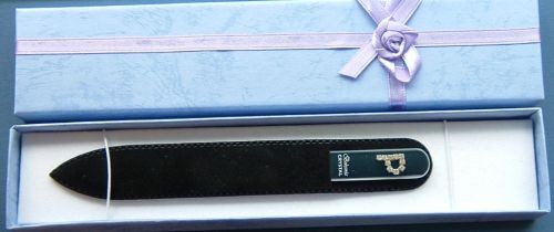 Skleněný pilník na nehty délky 140mm,tloušťky 2mm. Zdobeno kameny Swarovski, potisk pilníku logem Bohemia, sametový obal a dárková krabička s mašličkou .